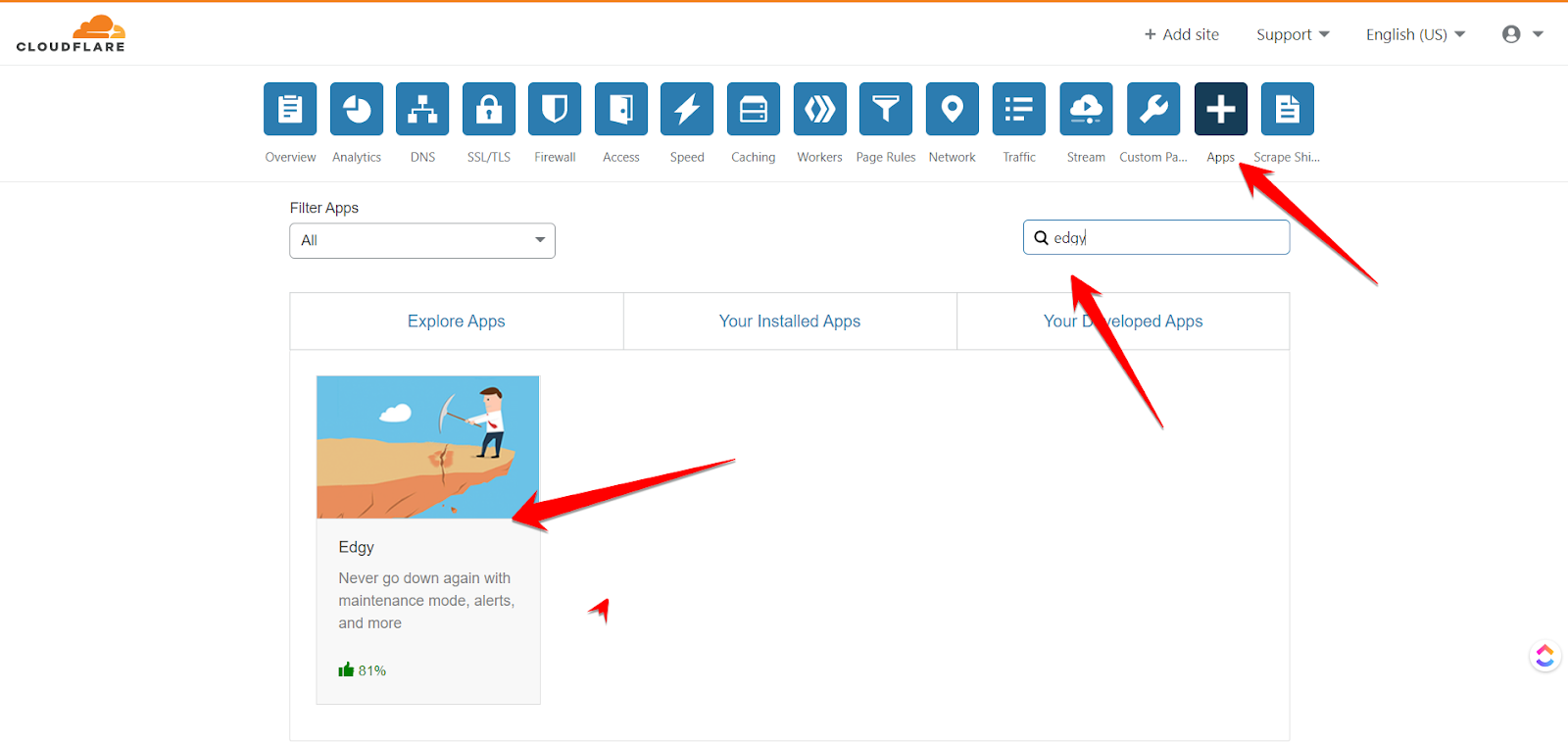 Don't worry; your website will not face any downtime since Cloudflare has received your DNS records.Wait a few minutes until your website runs on Cloudflare.Once activated, go to the Apps section and search for Edgy.